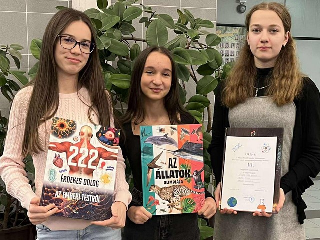A Petőfi Gimnázium Természettudományos Csapatversenyén a 15 induló közül iskolánk mindhárom csapata a legjobb 6 közé került. A döntő eredménye: 1. helyezett: Töreki Koppány, Pintér Máté, Németh Bendegúz Péter 3. helyezett: Vincze Lujza Darinka, Tarczi Annamária, Pálffy Zorka 5. helyezett: Bővebben